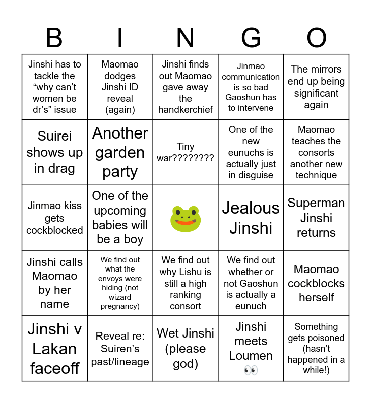 This bingo card has a free space and 24 words: We find out what the envoys were hiding (not wizard pregnancy), Reveal re: Suiren’s past/lineage, Tiny war????????, Jinshi v Lakan faceoff, The mirrors end up being significant again, Jinshi has to tackle the “why can’t women be dr’s” issue, Suirei shows up in drag, Maomao dodges Jinshi ID reveal (again), Jealous Jinshi, We find out why Lishu is still a high ranking consort, One of the new eunuchs is actually just in disguise, Jinmao kiss gets cockblocked, We find out whether or not Gaoshun is actually a eunuch, Maomao cockblocks herself, Another garden party, Jinshi meets Loumen 👀, Superman Jinshi returns, Jinshi finds out Maomao gave away the handkerchief, Maomao teaches the consorts another new technique, One of the upcoming babies will be a boy, Something gets poisoned (hasn’t happened in a while!), Jinshi calls Maomao by her name, Jinmao communication is so bad Gaoshun has to intervene and Wet Jinshi (please god).
