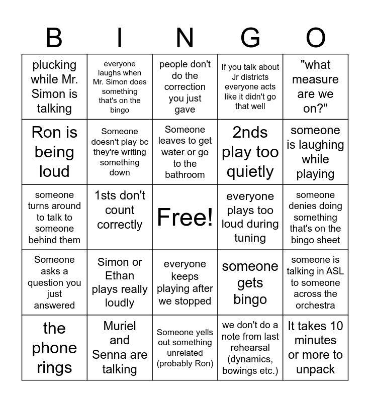 This bingo card has a free space and 24 words: Simon or Ethan plays really loudly, Muriel and Senna are talking, Someone leaves to get water or go to the bathroom, the phone rings, "what measure are we on?", plucking while Mr. Simon is talking, Ron is being loud, everyone laughs when Mr. Simon does something that's on the bingo, everyone plays too loud during tuning, everyone keeps playing after we stopped, 2nds play too quietly, someone turns around to talk to someone behind them, someone gets bingo, someone is talking in ASL to someone across the orchestra, Someone doesn't play bc they're writing something down, we don't do a note from last rehearsal (dynamics, bowings etc.), someone denies doing something that's on the bingo sheet, people don't do the correction you just gave, someone is laughing while playing, 1sts don't count correctly, It takes 10 minutes or more to unpack, Someone asks a question you just answered, If you talk about Jr districts everyone acts like it didn't go that well and Someone yells out something unrelated (probably Ron).