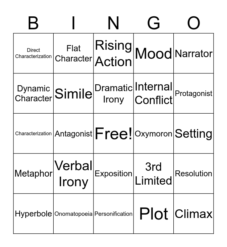 This bingo card has a free space and 42 words: Irony, Dramatic Irony, Situational Irony, Verbal Irony, Plot, Resolution, Climax, Falling Action, Rising Action, Exposition, Setting, Protagonist, Antagonist, Narrator, 1st Person, 3rd Limited, 3rd Omniscient, Characterization, Round Character, Flat Character, Dynamic Character, Static Character, Stock Character, Direct Characterization, Indirect Characterization, Conflict, Internal Conflict, External Conflict, Denotation, Imagery, Theme, Metaphor, Simile, Personification, Pun, Hyperbole, Onomatopoeia, Oxymoron, Foreshadowing, Tone, Mood and Allusion.