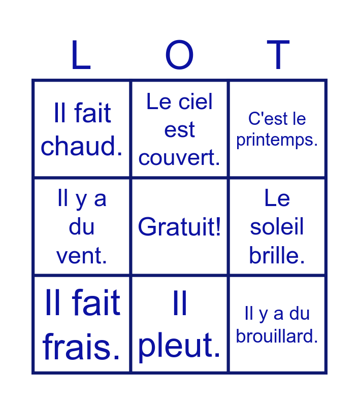 This bingo card has a free space and 37 words: Il neige., Il fait froid., Il fait du soleil., Il fait frais., Il y a un arc-en-ciel., C'est nuageux., Il pleut., Le ciel est gris., Il y a du brouillard., Il y a un orage., Le ciel est bleu., Il y a du vent., Il y a des nuages., Il fait mauvais., Le soleil brille., C'est l'automne., Il fait beau., C'est le printemps., Il fait froid., C'est l'hiver., Il fait chaud., Il pleut., Il y a des éclaircies., C'est l'été., Il neige., Il grêle., Le ciel est couvert., Le ciel est dégagé., La saison, La pluie, La grêle, La neige, Le brouillard, Le degré, La température, Le vent souffle and Le brouillard.