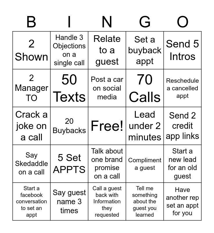 This bingo card has a free space and 24 words: 5 Set APPTS, Say guest name 3 times, Post a car on social media, Start a facebook conversation to set an appt, Send 5 Intros, 2 Shown, 2 Manager TO, Handle 3 Objections on a single call, Lead under 2 minutes, Talk about one brand promise on a call, 70 Calls, Crack a joke on a call, Compliment a guest, Start a new lead for an old guest, 50 Texts, Tell me something about the guest you learned, Send 2 credit app links, Relate to a guest, Reschedule a cancelled appt, 20 Buybacks, Have another rep set an appt for you, Say Skedaddle on a call, Set a buyback appt and Call a guest back with Information they requested.