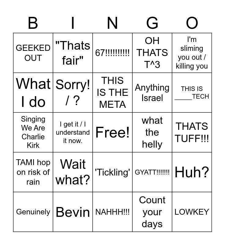 This bingo card has a free space and 24 words: Wait what?, Bevin, THIS IS THE META, Genuinely, I'm sliming you out / killing you, GEEKED OUT, What I do, "Thats fair", what the helly, 'Tickling', Anything Israel, Singing We Are Charlie Kirk, GYATT!!!!!!!, Huh?, Sorry! / ?, Count your days, THATS TUFF!!!, 67!!!!!!!!!!, THIS IS _____TECH, I get it / I understand it now., LOWKEY, TAMI hop on risk of rain, OH THATS T^3 and NAHHH!!!.