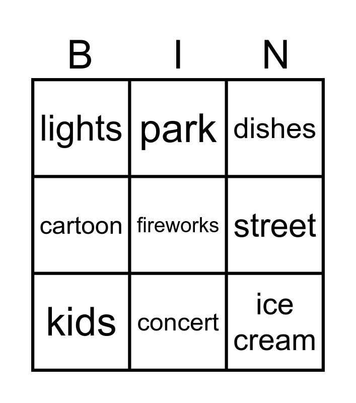 This bingo card has a free space and 8 words: street, dishes, park, kids, lights, ice cream, cartoon and concert.