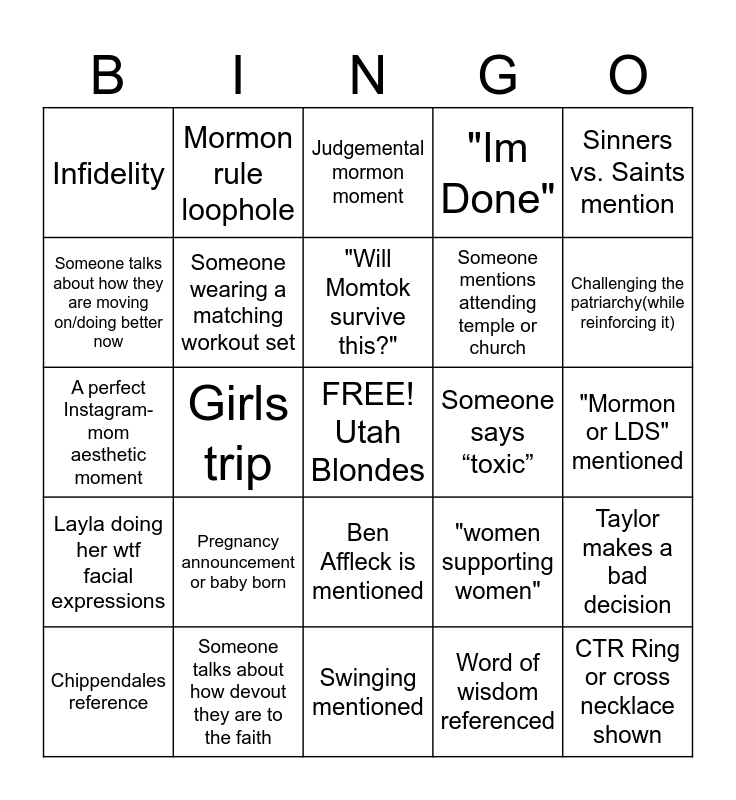 This bingo card has a free space and 64 words: DadTok mention, 3 non garment friendly outfits shown, Demi tries something new, Taylor makes a bad decision, Alcohol, TikTok video filmed, Mormon rule loophole, DWTS mentioned, "Will Momtok survive this?", Influencer event, Ben Affleck is mentioned, Utah cultural/society norms mentioned, "Mormon or LDS" mentioned, Sinners vs. Saints mention, Swig, Someone talks about how they are moving on/doing better now, Girls trip, Infidelity, Teaser for Taylor's Bachelorette season, Someone mentions attending temple or church, Pregnancy announcement or baby born, Layla doing her wtf facial expressions, "Im Done", Music gets dramatic, Taylors family shown, Show religious symbols or christian buildings etc, Someone mentions their brand/business, Plastic surgery mention, Prayer mention, Legal issues, Beige Utah house shown, Taylor and Dakota Fight, Toxic mormon family dynamics, "clean the air", Challenging the patriarchy(while reinforcing it), Chippendales reference, Fruity pebbles mentioned, Word of wisdom referenced, kitchen island scene, Someone wearing a matching workout set, A perfect Instagram-mom aesthetic moment, Someone says “toxic”, Mayci or Jen curses, Group chat drama, Mormon wall art, CTR Ring or cross necklace shown, Someone talks about how devout they are to the faith, See hair extensions, "women supporting women", Whitney says she doesn't care, Gender roles, A wife questioning her role, Swinging mentioned, Talking about drama in a car, Talks about God, Social media controversy, Judgemental mormon moment, Hot White Jesus shown, "This is not what Momtok is about", Men treating women poorly, Mormon lore mention, Someone says "Blessings", Utah brand seen and Toxic masculinity moment.