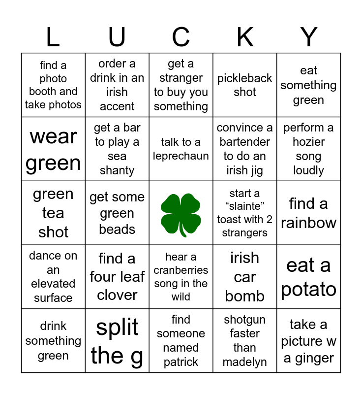 This bingo card has a free space and 24 words: find a four leaf clover, split the g, talk to a leprechaun, drink something green, eat something green, find a photo booth and take photos, wear green, order a drink in an irish accent, start a “slainte” toast with 2 strangers, hear a cranberries song in the wild, convince a bartender to do an irish jig, green tea shot, irish car bomb, eat a potato, get a bar to play a sea shanty, shotgun faster than madelyn, find a rainbow, get a stranger to buy you something, perform a hozier song loudly, get some green beads, take a picture w a ginger, dance on an elevated surface, pickleback shot and find someone named patrick.
