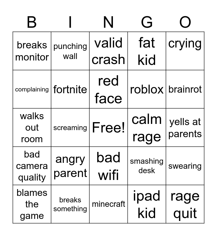 This bingo card has a free space and 24 words: angry parent, breaks something, red face, blames the game, crying, breaks monitor, complaining, punching wall, calm rage, bad wifi, roblox, walks out room, smashing desk, swearing, fortnite, ipad kid, yells at parents, valid crash, brainrot, screaming, rage quit, bad camera quality, fat kid and minecraft.