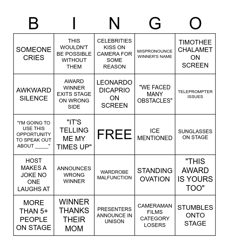 This bingo card has a free space and 24 words: ANNOUNCES WRONG WINNER, WINNER THANKS THEIR MOM, LEONARDO DICAPRIO ON SCREEN, MORE THAN 5+ PEOPLE ON STAGE, TIMOTHEE CHALAMET ON SCREEN, SOMEONE CRIES, AWKWARD SILENCE, THIS WOULDN'T BE POSSIBLE WITHOUT THEM, ICE MENTIONED, WARDROBE MALFUNCTION, "WE FACED MANY OBSTACLES", "I'M GOING TO USE THIS OPPORTUNITY TO SPEAK OUT ABOUT _____", STANDING OVATION, "THIS AWARD IS YOURS TOO", AWARD WINNER EXITS STAGE ON WRONG SIDE, CAMERAMAN FILMS CATEGORY LOSERS, SUNGLASSES ON STAGE, CELEBRITIES KISS ON CAMERA FOR SOME REASON, TELEPROMPTER ISSUES, "IT'S TELLING ME MY TIMES UP", STUMBLES ONTO STAGE, HOST MAKES A JOKE NO ONE LAUGHS AT, MISPRONOUNCE WINNER'S NAME and PRESENTERS ANNOUNCE IN UNISON.