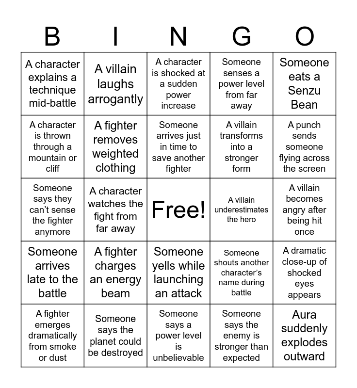 This bingo card has a free space and 50 words: Someone screams while powering up, Aura suddenly explodes outward, A crater appears after a punch, Someone says a power level is unbelievable, A fighter charges an energy beam, Two energy beams collide in a beam struggle, A villain laughs arrogantly, Someone implies “this isn’t even my final form”, A character is thrown through a mountain or cliff, Someone teleports suddenly using Instant Transmission, A fighter removes weighted clothing, Someone senses a power level from far away, A dramatic close-up of shocked eyes appears, Someone shouts another character’s name during battle, The ground shatters from a power-up, A character powers up for an extended time, Someone arrives just in time to save another fighter, A villain underestimates the hero, A hero stands back up after appearing defeated, Someone eats a Senzu Bean, A character watches the fight from far away, Someone says the enemy is stronger than expected, A character explains a technique mid-battle, A villain transforms into a stronger form, An energy blast destroys part of the landscape, A character refuses to give up, A punch sends someone flying across the screen, Someone charges a finishing move, A character is shocked at a sudden power increase, Someone yells while launching an attack, A character survives a massive attack, Someone says “Impossible!”, A fighter vanishes and reappears behind the opponent, A character attempts or performs a sacrifice, Someone says the planet could be destroyed, A dramatic pause happens before a final attack, A character clenches a fist while shaking with effort, A fighter blocks an attack with one hand, Someone comments on how fast the fighters are, A villain becomes angry after being hit once, Someone powers up again after already powering up, A character fires rapid energy blasts, A named attack is shouted (like Kamehameha), Someone gets buried in rubble, A fighter emerges dramatically from smoke or dust, Someone says they can’t sense the fighter anymore, Someone declares they will finish the fight now, A character collapses from exhaustion, Someone arrives late to the battle and The hero wins through sheer stubbornness.