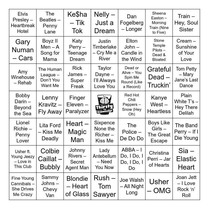 This bingo card has a free space and 100 words: 10,000 Maniacs – Because the Night, ABBA – I Do, I Do, I Do, I Do, I Do, Amy Winehouse – Rehab, Avril Lavigne – Sk8er Boi, B.O.B. ft. Rivers Cuomo – Magic, Bad Bunny – Moscow Mule, Barenaked Ladies – Million Dollars, Bee Gees – How Can You Mend a Broken Heart, Beetlejuice – The Whole Being Dead Thing, Beyonce – Irreplaceable, Billy Joel – It’s Still Rock and Roll to Me, Billy Ocean – There’ll Be Sad Songs (To Make You Cry), Blondie – Heart of Glass, Bobby Darin – Beyond the Sea, Bon Jovi – Wanted Dead or Alive, Boys Like Girls – The Great Escape, Boyz II Men – A Song for Mama, Britney Spears – Till the World Ends, Calloway – I Wanna Be Rich, Camila Cabello – Never Be the Same, Carrie Underwood – Before He Cheats, Chris Daughtry – Home, Christina Perri – Jar of Hearts, Christopher Cross – Sailing, Colbie Caillat – Bubbly, Cream – Sunshine of Your Love, Dan Fogelberg – Longer, Dead or Alive – You Spin Me Round (Like a Record), Dire Straits – Money for Nothing, Dolly Parton – Here You Come Again, Elton John – Candle in the Wind, Elvis Presley – Heartbreak Hotel, Emerson, Lake & Palmer – Lucky Man, Fine Young Cannibals – She Drives Me Crazy, Finger Eleven – Paralyzer, Gary Numan – Cars, Grateful Dead – Truckin’, Greg Kihn – The Breakup Song, Heart – Magic Man, Joan Jett – I Love Rock ‘n’ Roll, Joe Walsh – All Night Long, Johnny Rivers – Secret Agent Man, Justin Timberlake – Cry Me a River, Kanye West – Heartless, Katy Perry – Teenage Dream, Ke$ha – Tik Tok, Kenny Rogers – Coward of the County, Lady Antebellum – Need You Now, Lady Gaga – Paparazzi, Lenny Kravitz – Fly Away, Linda Ronstadt – Blue Bayou, Lionel Richie – Penny Lover, Lita Ford – Kiss Me Deadly, Little River Band – Lady, Michael Bublé – Haven’t Met You Yet, Michael Jackson – Rock with You, Mike Posner – Cooler than Me, Miranda Lambert – Mama’s Broken Heart, My Chemical Romance – Welcome to the Black Parade, Nelly – Just a Dream, Nickelback – Rockstar, Oingo Boingo – Dead Man’s Party, Olivia Newton-John – A Little More Love, Our Lady Peace – Superman’s Dead, Owl City – Fireflies, Pink – Walk Away, Pink Floyd – Money, Plain White T’s – Hey There Delilah, Puddle of Mudd – Blurry, Quarterflash – Harden My Heart, Red Hot Chili Peppers – Snow (Hey Oh), Rick James – Super Freak, Rob Zombie – Living Dead Girl, Rolling Stones – Dead Flowers, Rush – Tom Sawyer, Sammy Johns – Chevy Van, Santana - Winning, Sheena Easton – Morning Train (Nine to Five), Sia – Elastic Heart, Sixpence None the Richer – Kiss Me, Smokey Robinson – Being with You, Stone Temple Pilots – Dead & Bloated, Talking Heads – Take Me to the River, Taylor Dayne – I’ll Always Love You, The Band Perry – If I Die Young, The Beatles – Penny Lane, The Doobie Brothers – What a Fool Believes, The Honeydrippers – Sea of Love, The Hues Corporation – Rock the Boat, The Human League – Don’t You Want Me, The Police – De Do Do, Timbaland – Give It to Me, Tom Petty – Free Fallin’, Tom Petty – Mary Jane’s Last Dance, Train – Hey, Soul Sister, Travis Tritt – Here’s a Quarter (Call Someone Who Cares), Usher – OMG, Usher ft. Young Jeezy – Love in This Club, Vangelis – Chariots of Fire and Whitney Houston – Where Do Broken Hearts Go.