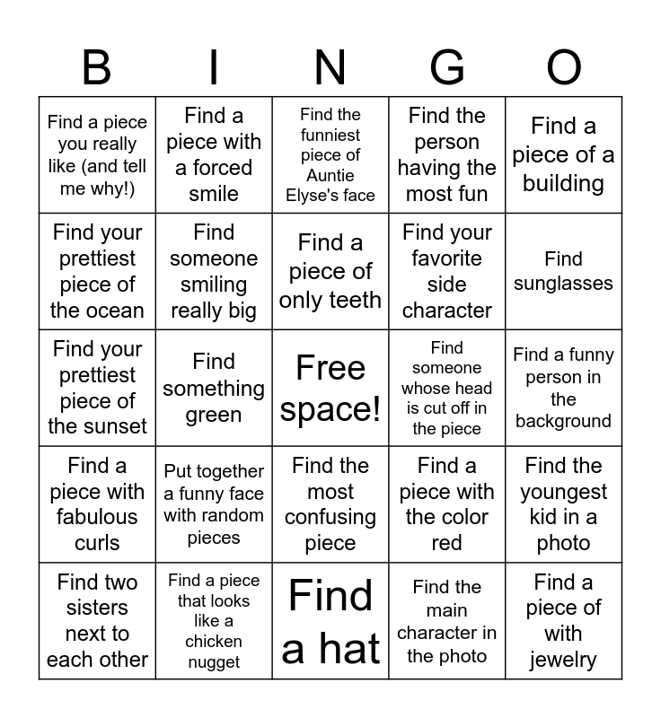 This bingo card has a free space and 24 words: Put together a funny face with random pieces, Find a piece that looks like a chicken nugget, Find a piece of only teeth, Find two sisters next to each other, Find a piece of a building, Find a piece you really like (and tell me why!), Find your prettiest piece of the ocean, Find a piece with a forced smile, Find someone whose head is cut off in the piece, Find the most confusing piece, Find your favorite side character, Find your prettiest piece of the sunset, Find a piece with the color red, Find the youngest kid in a photo, Find someone smiling really big, Find the main character in the photo, Find a funny person in the background, Find the funniest piece of Auntie Elyse's face, Find sunglasses, Find something green, Find a piece of with jewelry, Find a piece with fabulous curls, Find the person having the most fun and Find a hat.