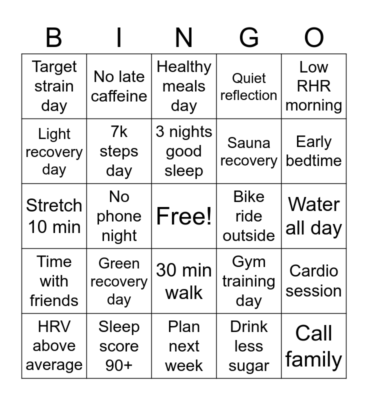 This bingo card has a free space and 24 words: Green recovery day, Sleep score 90+, 3 nights good sleep, HRV above average, Low RHR morning, Target strain day, Light recovery day, No late caffeine, Bike ride outside, 30 min walk, Sauna recovery, Stretch 10 min, Gym training day, Cardio session, 7k steps day, Drink less sugar, Water all day, Healthy meals day, Early bedtime, No phone night, Call family, Time with friends, Quiet reflection and Plan next week.