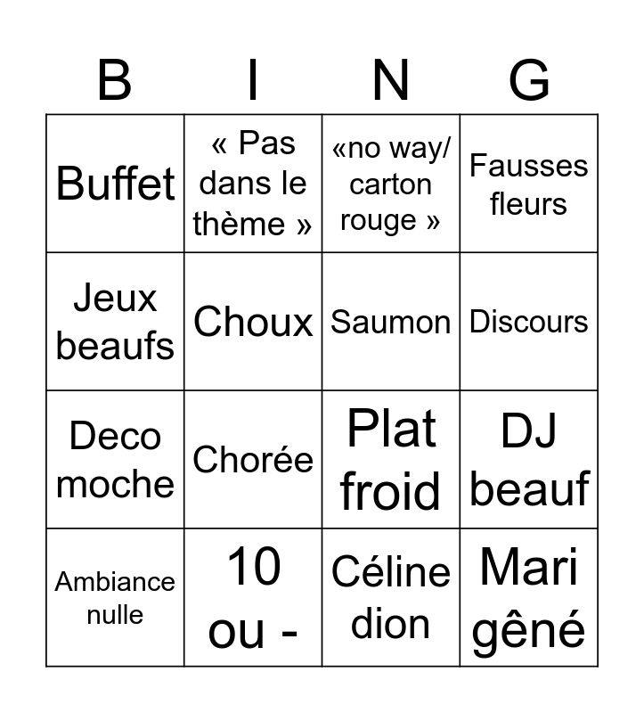 This bingo card has 16 words: 10 ou -, DJ beauf, «no way/ carton rouge », Buffet, Deco moche, « Pas dans le thème », Plat froid, Céline dion, Jeux beaufs, Choux, Ambiance nulle, Fausses fleurs, Chorée, Discours, Saumon and Mari gêné.