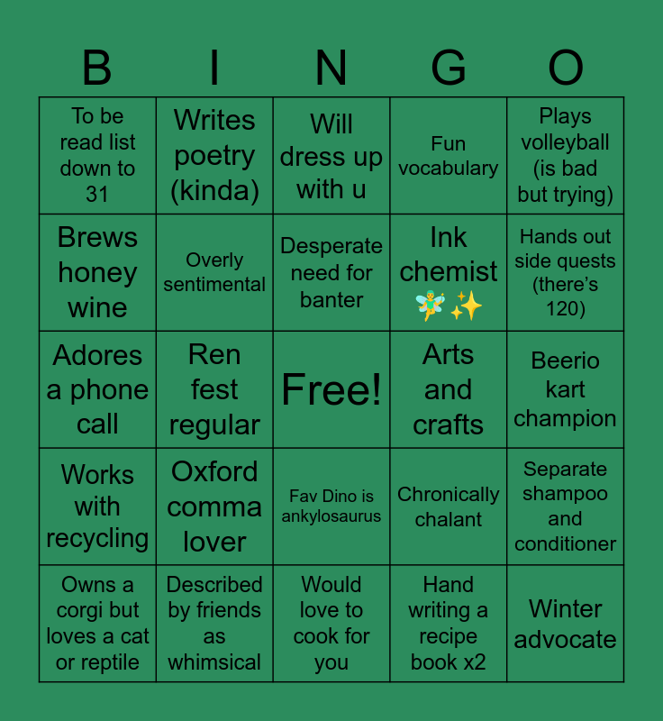 This bingo card has a free space and 24 words: Oxford comma lover, Described by friends as whimsical, Desperate need for banter, Owns a corgi but loves a cat or reptile, Plays volleyball (is bad but trying), To be read list down to 31, Brews honey wine, Writes poetry (kinda), Arts and crafts, Fav Dino is ankylosaurus, Ink chemist 🧚♂️✨, Adores a phone call, Chronically chalant, Separate shampoo and conditioner, Overly sentimental, Hand writing a recipe book x2, Beerio kart champion, Will dress up with u, Hands out side quests (there’s 120), Ren fest regular, Winter advocate, Works with recycling, Fun vocabulary and Would love to cook for you.