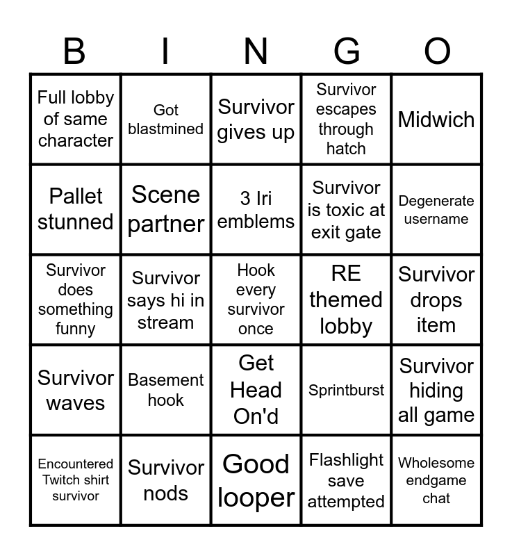 This bingo card has a free space and 24 words: Basement hook, Survivor nods, 3 Iri emblems, Encountered Twitch shirt survivor, Midwich, Full lobby of same character, Pallet stunned, Got blastmined, RE themed lobby, Get Head On'd, Survivor is toxic at exit gate, Survivor does something funny, Sprintburst, Survivor hiding all game, Scene partner, Flashlight save attempted, Survivor drops item, Survivor gives up, Degenerate username, Survivor says hi in stream, Wholesome endgame chat, Survivor waves, Survivor escapes through hatch and Good looper.