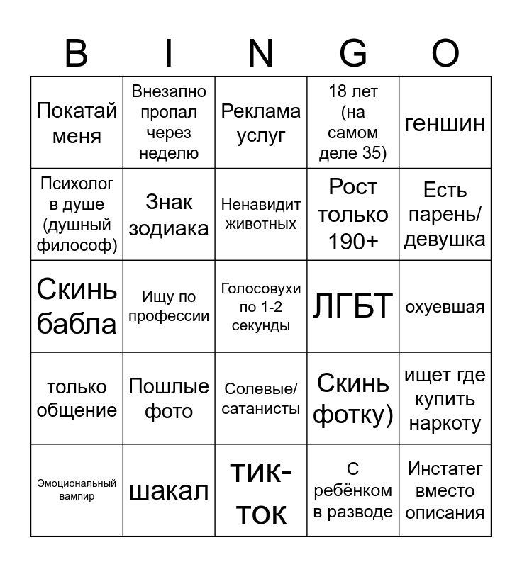 This bingo card has a free space and 29 words: Эмоциональный вампир, Без описания, Ищу по профессии, Фанат КИШ, Покатай меня, Реклама услуг, Знак зодиака, Пошлые фото, ЛГБТ, шакал, охуевшая, Инстатег вместо описания, тик-ток, С ребёнком в разводе, Есть парень/девушка, К-поп, Солевые/сатанисты, только общение, геншин, Скинь бабла, Скинь фотку), Плохие мемы, Рост только 190+, Психолог в душе (душный философ), 18 лет (на самом деле 35), Внезапно пропал через неделю, ищет где купить наркоту, Ненавидит животных and В душ и без меня?).