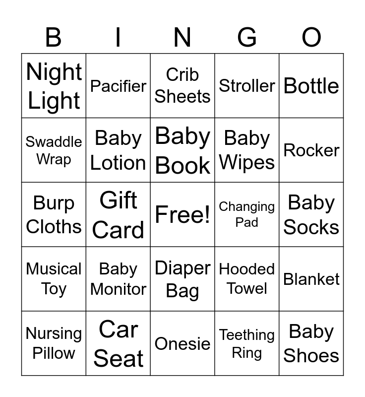 This bingo card has a free space and 29 words: Nursing Pillow, Stuffed Animal, Gift Card, Baby Soap, Night Light, Crib Sheets, Baby Lotion, Baby Monitor, Changing Pad, Car Seat, Baby Socks, Baby Shoes, Onesie, Teething Ring, Rocker, Nursery Decor, Diaper Bag, Musical Toy, Bottle, Burp Cloths, Hooded Towel, Bouncer, Baby Wipes, Swaddle Wrap, Stroller, Pacifier, Blanket, Baby Book and Diaper Cream.