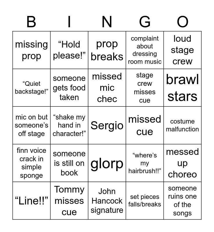 This bingo card has a free space and 24 words: someone is still on book, Tommy misses cue, missed mic chec, “Line!!”, loud stage crew, missing prop, “Quiet backstage!”, “Hold please!”, missed cue, glorp, stage crew misses cue, mic on but someone’s off stage, “where’s my hairbrush!!”, messed up choreo, someone gets food taken, set pieces falls/breaks, costume malfunction, prop breaks, brawl stars, “shake my hand in character!”, someone ruins one of the songs, finn voice crack in simple sponge, complaint about dressing room music and John Hancock signature.