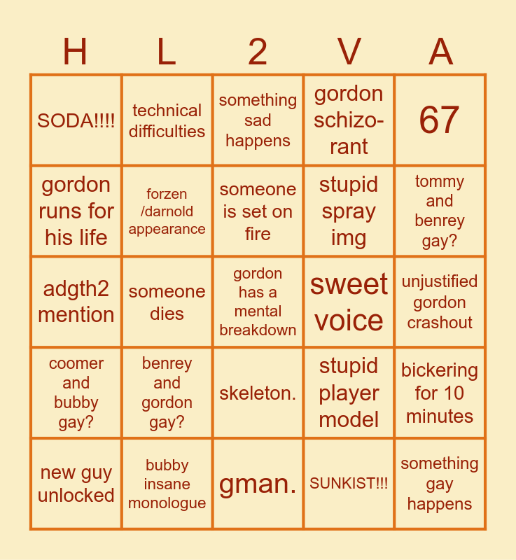 This bingo card has a free space and 24 words: benrey and gordon gay?, bubby insane monologue, someone is set on fire, new guy unlocked, 67, SODA!!!!, gordon runs for his life, technical difficulties, sweet voice, skeleton., stupid spray img, adgth2 mention, stupid player model, bickering for 10 minutes, forzen /darnold appearance, SUNKIST!!!, unjustified gordon crashout, something sad happens, tommy and benrey gay?, someone dies, something gay happens, coomer and bubby gay?, gordon schizo-rant and gman..