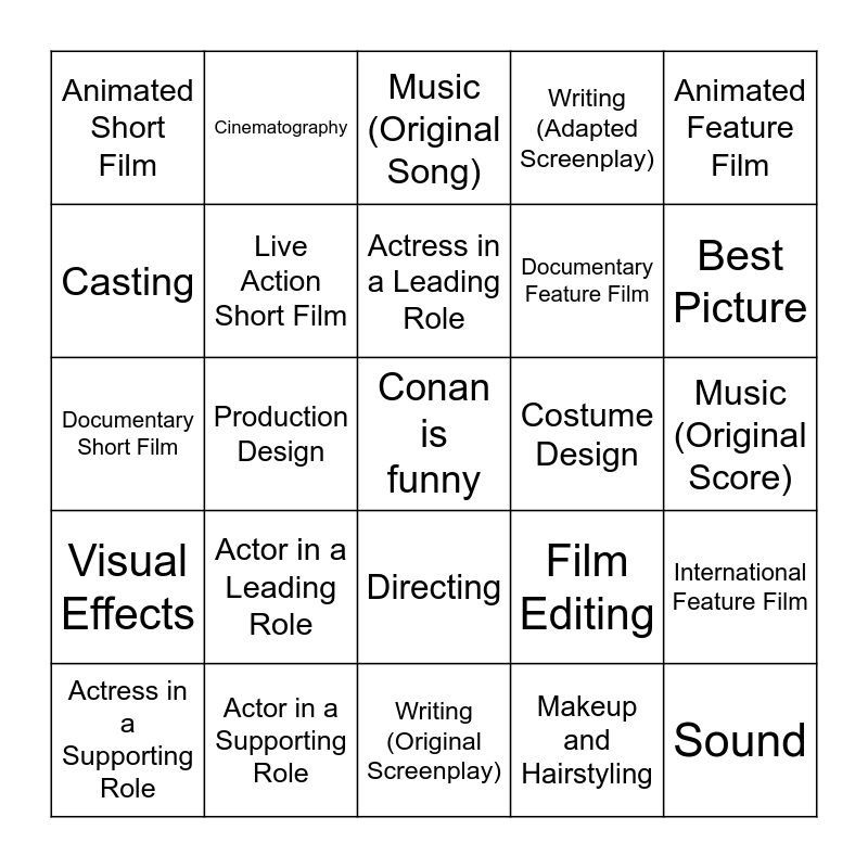 This bingo card has a free space and 24 words: Actor in a Leading Role, Actor in a Supporting Role, Actress in a Leading Role, Actress in a Supporting Role, Animated Feature Film, Animated Short Film, Casting, Cinematography, Costume Design, Directing, Documentary Feature Film, Documentary Short Film, Film Editing, International Feature Film, Live Action Short Film, Makeup and Hairstyling, Music (Original Score), Music (Original Song), Best Picture, Production Design, Sound, Visual Effects, Writing (Adapted Screenplay) and Writing (Original Screenplay).