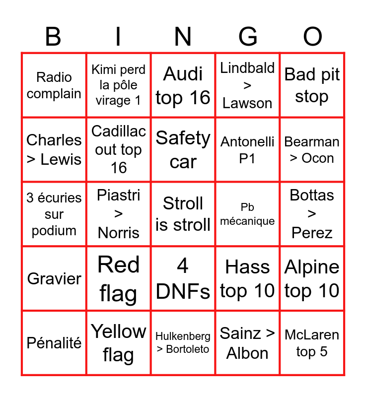 This bingo card has a free space and 24 words: Red flag, Yellow flag, Safety car, Pénalité, Bad pit stop, Radio complain, Charles > Lewis, Kimi perd la pôle virage 1, Pb mécanique, 4 DNFs, Antonelli P1, 3 écuries sur podium, Hass top 10, Alpine top 10, Cadillac out top 16, Sainz > Albon, Bottas > Perez, Audi top 16, Bearman > Ocon, Piastri > Norris, McLaren top 5, Gravier, Lindbald > Lawson and Hulkenberg > Bortoleto.