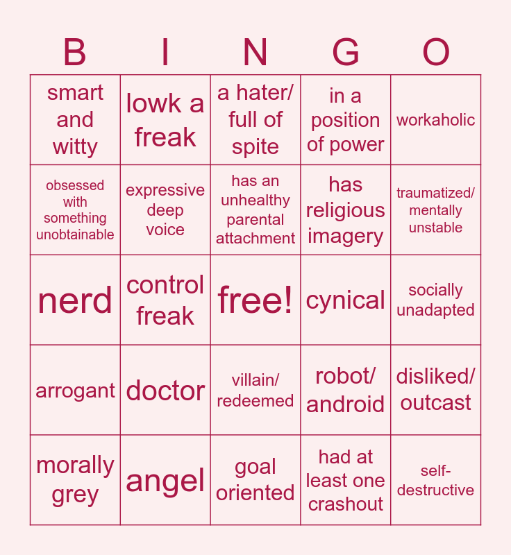 This bingo card has a free space and 24 words: morally grey, doctor, has an unhealthy parental attachment, had at least one crashout, workaholic, smart and witty, lowk a freak, a hater/ full of spite, cynical, socially unadapted, nerd, expressive deep voice, robot/ android, disliked/ outcast, obsessed with something unobtainable, angel, goal oriented, in a position of power, traumatized/ mentally unstable, arrogant, control freak, villain/ redeemed, has religious imagery and self-destructive.