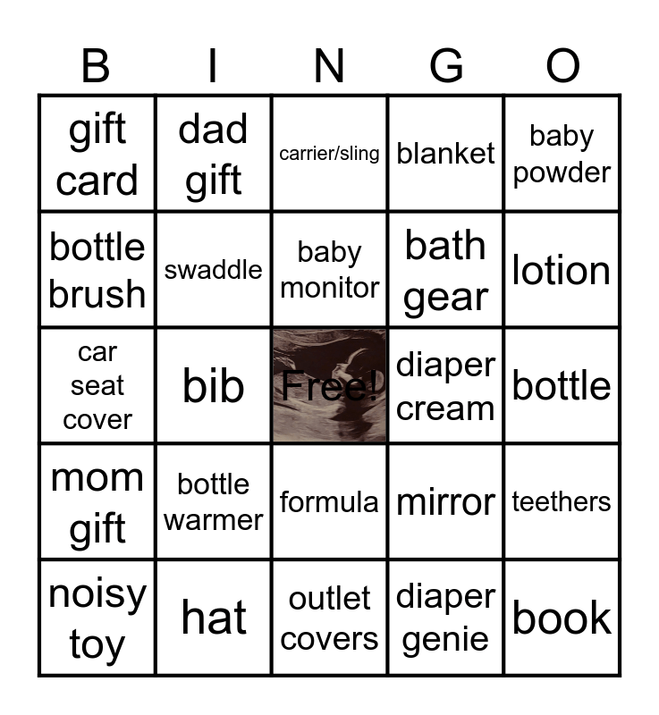 This bingo card has a free space and 38 words: socks, booties, spoons, swaddle, teethers, bottle warmer, baby monitor, pump, baby powder, bath gear, bib, blanket, book, bottle, bottle brush, mom gift, burp cloth, carrier/sling, bedding, diaper cream, gift card, hat, lotion, noisy toy, night light, outlet covers, pacifier, pajamas, stuffy, gift set, room decor, formula, diaper genie, dad gift, car toy, mirror, car seat cover and cotton swabs.