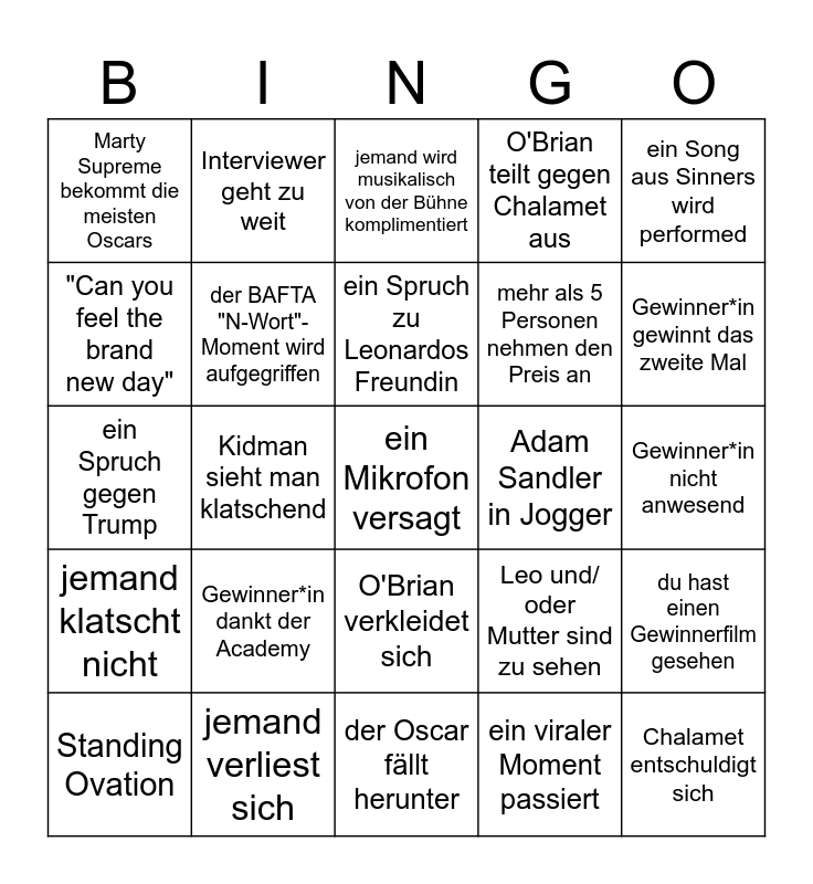 This bingo card has 25 words: Gewinner*in dankt der Academy, der Oscar fällt herunter, ein Spruch zu Leonardos Freundin, Standing Ovation, ein Song aus Sinners wird performed, Marty Supreme bekommt die meisten Oscars, "Can you feel the brand new day", Interviewer geht zu weit, Adam Sandler in Jogger, O'Brian verkleidet sich, mehr als 5 Personen nehmen den Preis an, ein Spruch gegen Trump, Leo und/ oder Mutter sind zu sehen, du hast einen Gewinnerfilm gesehen, der BAFTA "N-Wort"-Moment wird aufgegriffen, Chalamet entschuldigt sich, Gewinner*in nicht anwesend, jemand wird musikalisch von der Bühne komplimentiert, Gewinner*in gewinnt das zweite Mal, Kidman sieht man klatschend, ein Mikrofon versagt, jemand verliest sich, jemand klatscht nicht, O'Brian teilt gegen Chalamet aus and ein viraler Moment passiert.