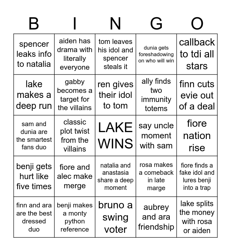 This bingo card has a free space and 24 words: fiore and alec make merge, benji makes a monty python reference, ren gives their idol to tom, finn and ara are the best dressed duo, callback to tdi all stars, spencer leaks info to natalia, lake makes a deep run, aiden has drama with literally everyone, say uncle moment with sam, natalia and anastasia share a deep moment, ally finds two immunity totems, sam and dunia are the smartest fans duo, rosa makes a comeback in late marge, fiore finds a fake idol and lures benji into a trap, gabby becomes a target for the villains, aubrey and ara friendship, fiore nation rise, tom leaves his idol and spencer steals it, finn cuts evie out of a deal, classic plot twist from the villains, lake splits the money with rosa or aiden, benji gets hurt like five times, dunia gets foreshadowing on who will win and bruno a swing voter.