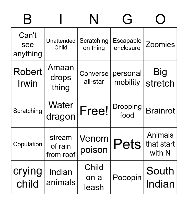 This bingo card has a free space and 24 words: stream of rain from roof, Indian animals, Converse all-star, crying child, Zoomies, Can't see anything, Robert Irwin, Unattended Child, Dropping food, Venom poison, personal mobility, Scratching, Pets, Animals that start with N, Amaan drops thing, Pooopin, Brainrot, Scratching on thing, Big stretch, Water dragon, South Indian, Copulation, Escapable enclosure and Child on a leash.