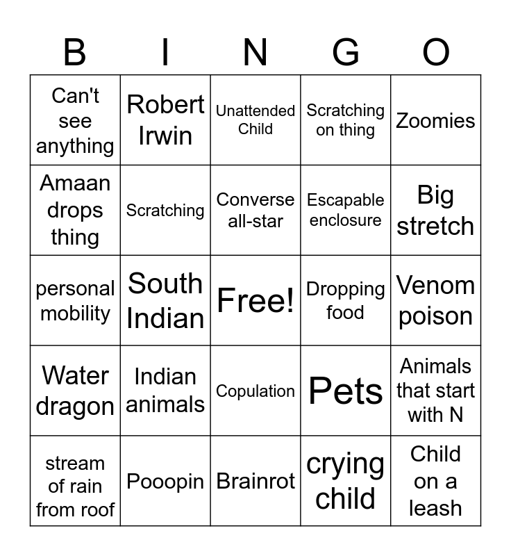 This bingo card has a free space and 24 words: stream of rain from roof, Indian animals, Converse all-star, crying child, Zoomies, Can't see anything, Robert Irwin, Unattended Child, Dropping food, Venom poison, personal mobility, Scratching, Pets, Animals that start with N, Amaan drops thing, Pooopin, Brainrot, Scratching on thing, Big stretch, Water dragon, South Indian, Copulation, Escapable enclosure and Child on a leash.