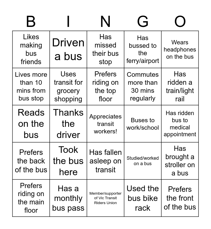 This bingo card has a free space and 24 words: Took the bus here, Has a monthly bus pass, Prefers riding on the top floor, Prefers riding on the main floor, Wears headphones on the bus, Likes making bus friends, Lives more than 10 mins from bus stop, Driven a bus, Buses to work/school, Has fallen asleep on transit, Commutes more than 30 mins regularly, Reads on the bus, Studied/worked on a bus, Has brought a stroller on a bus, Uses transit for grocery shopping, Used the bus bike rack, Has ridden bus to medical appointment, Has missed their bus stop, Has ridden a train/light rail, Thanks the driver, Prefers the front of the bus, Prefers the back of the bus, Has bussed to the ferry/airport and Member/supporter of Vic Transit Riders Union.