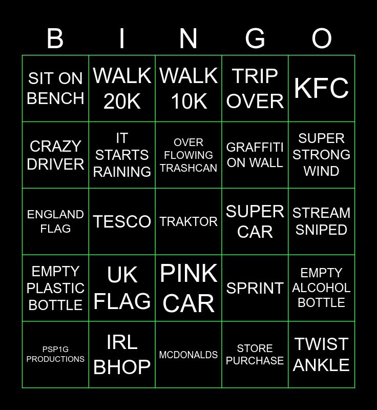 This bingo card has a free space and 24 words: UK FLAG, IRL BHOP, OVER FLOWING TRASHCAN, PSP1G PRODUCTIONS, KFC, SIT ON BENCH, CRAZY DRIVER, WALK 20K, SUPER CAR, PINK CAR, GRAFFITI ON WALL, ENGLAND FLAG, SPRINT, EMPTY ALCOHOL BOTTLE, IT STARTS RAINING, STORE PURCHASE, STREAM SNIPED, WALK 10K, SUPER STRONG WIND, TESCO, TWIST ANKLE, EMPTY PLASTIC BOTTLE, TRIP OVER and MCDONALDS.