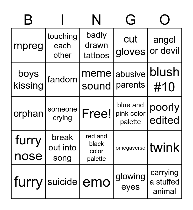 This bingo card has a free space and 24 words: break out into song, suicide, meme sound, furry, angel or devil, mpreg, boys kissing, touching each other, blue and pink color palette, red and black color palette, abusive parents, orphan, omegaverse, twink, fandom, glowing eyes, poorly edited, badly drawn tattoos, blush #10, someone crying, carrying a stuffed animal, furry nose, cut gloves and emo.