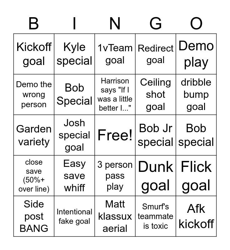 This bingo card has a free space and 69 words: 2V1 shadow defense, Bob special, Double touch goal, 2 person passing play, Intentional fake goal, 2 touch outplay goal, Redirect goal, Brick bros bounce shot (tm), Demo play, Team pinch, Flick goal, Successful fake kickoff, Kickoff goal, 1vTeam goal, flip reset goal, Josh special goal, 3 person pass play, Ceiling shot goal, 110kph/ 68mph goal, close save (50%+ over line), Bob Jr special, Dunk goal, dribble bump goal, Team bump moment, Sniffin goes bad, Front post rotation goes wrong, Crossbar BANG, Ballside rotation clear dunk, Smurf's teammate is toxic, 20kph/12mph or slower goal, Kyle special, Smurf clips on us, No man's land, Get pinched on, Harrison kickoff goes wrong, Miscomm leads to opponent goal, Harrison overextends for a demo, Dime the other team, Demo the wrong person, Harrison BOOMER flick into backboard, Easy save whiff, Afk kickoff, Someone shoots it into the corner, Full team commit whiff, Backpass goes wrong, Side post BANG, SHINY (boost over ball), Team bump away from a save, Matt slams crossbar, Bob Special, Harrison says "If I was a little better I...", Josh types to the other team, "FAKING!", Matt klassux aerial, Kyle lags, Harrison steals goal, Kyle shoots it straight into the corner, Felix Special (own goal), Matt 50/50 goal, Garden variety, "It's better with all 3", Ryan Special (doink shot), Nice double (it was pointless), Matt hunts a low five, Natural passer moment, Get down Mr. President!, Bob Jr. Special, Harrison stops comming with no warning and Harrison screams.