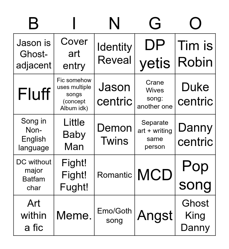 This bingo card has 29 words: Art within a fic, Band AU, Demon Twins, Angst, Tim is Robin, Fluff, Cover art entry, Emo/Goth song, Separate art + writing same person, Ghost King Danny, Song in Non-English language, Fic somehow uses multiple songs (concept Album idk), Crane Wives song, MCD, Danny centric, SuperFam char centric, Little Baby Man, Romantic, DP yetis, Pop song, DC without major Batfam char, Meme., Jason centric, Crane Wives song: another one, Duke centric, Jason is Ghost-adjacent, Fight! Fight! Fught!, Identity Reveal and Danny move(s/ed) to Gotham.