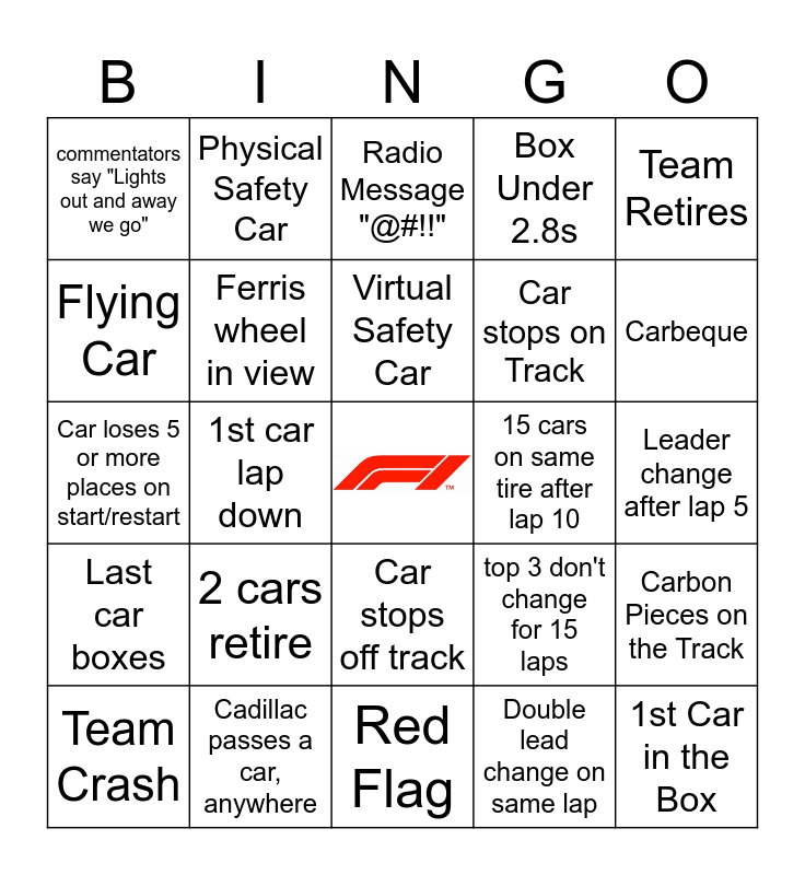 This bingo card has a free space and 31 words: 1st car retires, Cadillac passes a car, anywhere, Virtual Safety Car, Bad pit over 4 sec., Team Retires, commentators say "Lights out and away we go", 1st car lap down, Red Flag, Car stops on Track, 1st Car in the Box, Team Crash, 2 cars retire, Double lead change on same lap, Spin to Win (Car spins 360 & Continues), Last car boxes, Nose Job in the Box, Car stops off track, 15 cars on same tire after lap 10, Leader change after lap 5, Stewards investigate a penalty, Physical Safety Car, Yellow Flag, top 3 don't change for 15 laps, Carbeque, Car loses 5 or more places on start/restart, Ferris wheel in view, Radio Message "@#!!", Box Under 2.8s, Carbon Pieces on the Track, Flying Car and Liberated Tire.