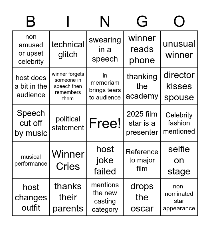 This bingo card has a free space and 24 words: Winner Cries, thanks their parents, in memoriam brings tears to audience, host changes outfit, unusual winner, non amused or upset celebrity, host does a bit in the audience, technical glitch, 2025 film star is a presenter, host joke failed, thanking the academy, Speech cut off by music, Reference to major film, selfie on stage, winner forgets someone in speech then remembers them, drops the oscar, Celebrity fashion mentioned, swearing in a speech, director kisses spouse, political statement, non-nominated star appearance, musical performance, winner reads phone and mentions the new casting category.