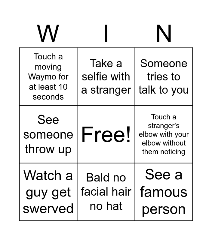This bingo card has a free space and 11 words: Pregnant woman, Someone we know, Touch a stranger's elbow with your elbow without them noticing, Watch a guy get swerved, Someone tries to talk to you, Touch a moving Waymo for at least 10 seconds, Bald no facial hair no hat, Climb something at least 6'2, See someone throw up, Take a selfie with a stranger and See a famous person.