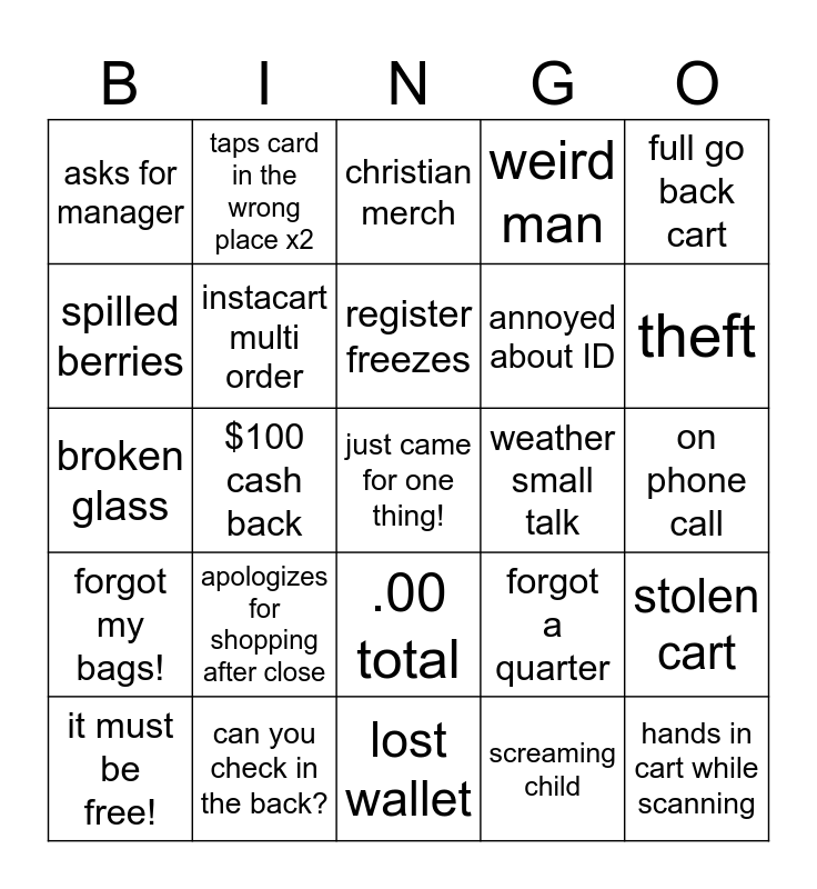 This bingo card has a free space and 24 words: apologizes for shopping after close, can you check in the back?, register freezes, it must be free!, full go back cart, asks for manager, spilled berries, taps card in the wrong place x2, weather small talk, .00 total, annoyed about ID, broken glass, forgot a quarter, stolen cart, instacart multi order, screaming child, on phone call, christian merch, theft, $100 cash back, hands in cart while scanning, forgot my bags!, weird man and lost wallet.