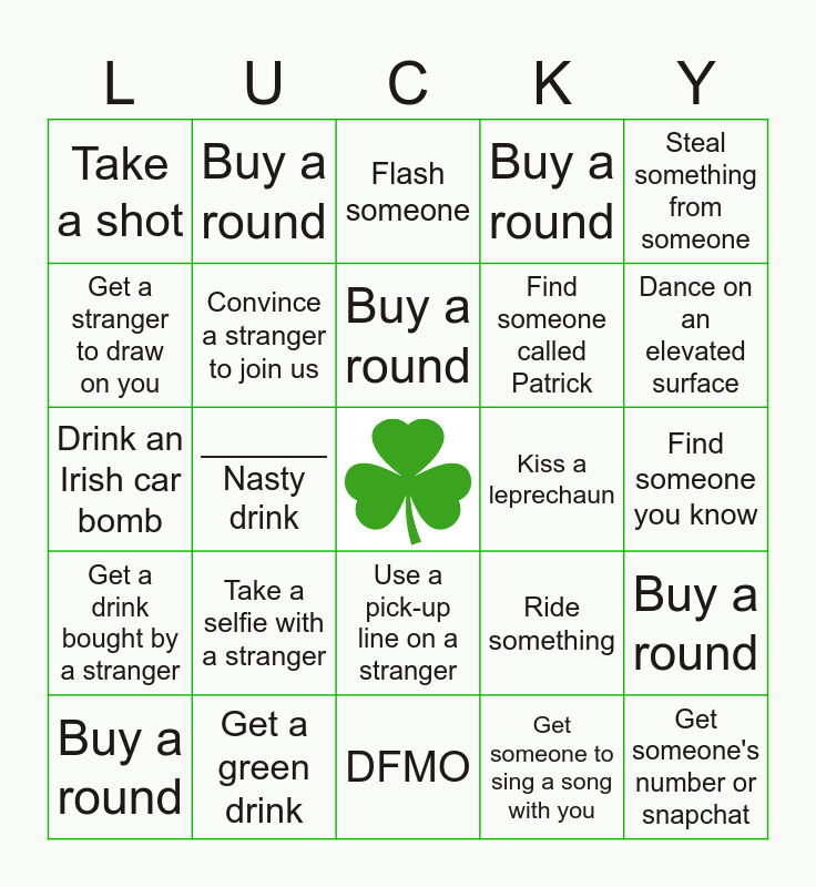 This bingo card has a free space and 29 words: Buy a round, Do an Irish Jig, _______ Nasty drink, Do a trick, Take a shot, Flash someone, Convince a stranger to join us, Take a selfie with a stranger, Kiss a leprechaun, Get a green drink, Find someone you know, Get someone's number or snapchat, DFMO, Get someone to sing a song with you, Dance on an elevated surface, Kiss someone on the cheek, Use a pick-up line on a stranger, Get a drink bought by a stranger, Steal something from someone, Drink an Irish car bomb, Ride something, Order a drink in an Irish accent, Find someone called Patrick, Get a stranger to draw on you, Buy a round, Buy a round, Buy a round, Buy a round and Buy a round.