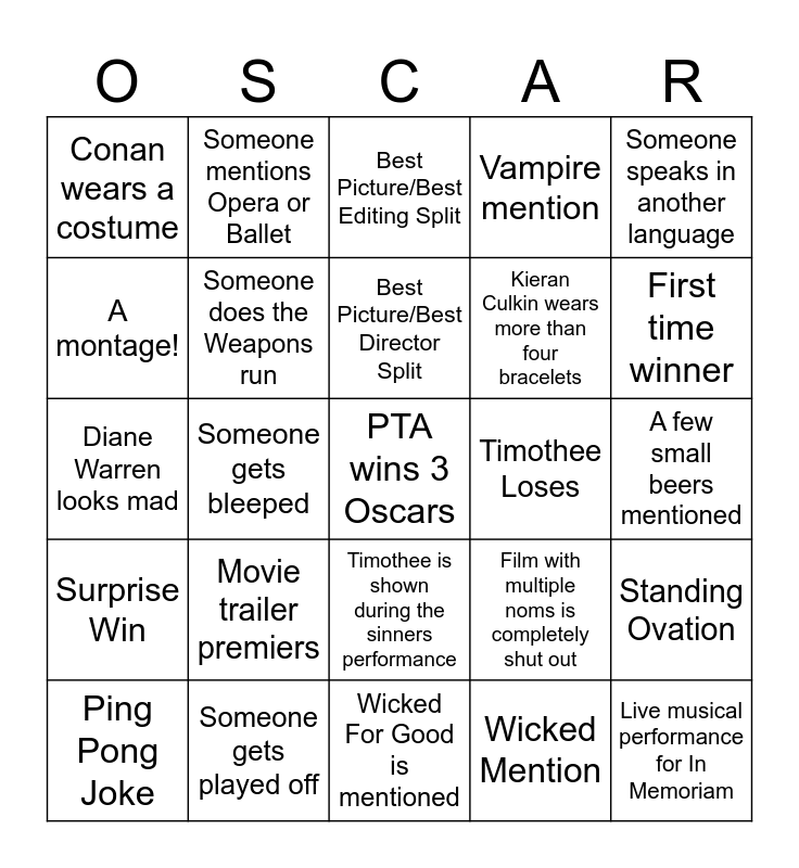 This bingo card has a free space and 34 words: Sean Penn shows up, Wicked Mention, Non-nominated song is performed, Joke about twins, Surprise Win, Someone does the Weapons run, Someone speaks in another language, Ping Pong Joke, Someone mentions Opera or Ballet, Timothee Apologizes, Best Picture/Best Director Split, Best Picture/Best Editing Split, Ryan Coogler wins 3 Oscars, Timothee wins, Timothee Loses, First time winner, Someone gets played off, Diane Warren looks mad, Movie trailer premiers, Film with multiple noms is completely shut out, Timothee is shown during the sinners performance, International Film winner wins at least one other award, Conan wears a costume, A few small beers mentioned, Wicked For Good is mentioned, Live musical performance for In Memoriam, Vampire mention, Host or Presenter sing, Kieran Culkin wears more than four bracelets, A montage!, Jimmy Kimmel mentions being previous host, Someone gets bleeped, Standing Ovation and Devil Wears Prada Mentioned.