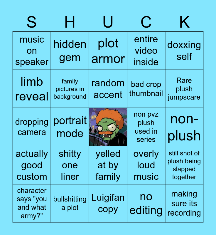 This bingo card has a free space and 49 words: Purple zombie in higher position, making sure its recording, bad Condition plush, Luigifan copy, shitty one liner, actual good joke, hidden gem, brainrot, limb reveal, younger sibling, family pictures in background, entire video inside, still shot of plush being slapped together, overly loud music, adlib sfx, Kevin MacLeod music, random accent, non pvz plush used in series, newspaper is freaky, doxxing self, portrait mode, no editing, music on speaker, bad crop thumbnail, hot glue/paper custom plush, Rare plush jumpscare, character says "you and what army?", the word "stuffed", yelled at by family, actually good custom, plush actively being destroyed, good plot, auto gen thumbnail, pet being used for the video, bullshitting a plot, foam custom, comissioned plush, well edited, non-plush, racism or homophobia, overswearing, whisper screaming, in a public server, TV in background, dropping camera, plot armor, filler, new recruit and potty humor.