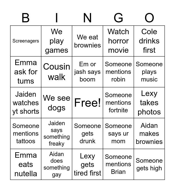 This bingo card has a free space and 24 words: Jaiden says something freaky, Aidan does something gay, Em or jash says boom, Emma eats nutella, Cole drinks first, Screenagers, Emma ask for tums, We play games, Someone mentions fortnite, Someone gets drunk, Someone mentions robin, Jaiden watches yt shorts, Someone says ur mom, Aidan makes brownies, Cousin walk, Someone mentions Brian, Lexy takes photos, We eat brownies, Someone plays music, We see dogs, Someone gets high, Someone mentions tattoos, Watch horror movie and Lexy gets tired first.