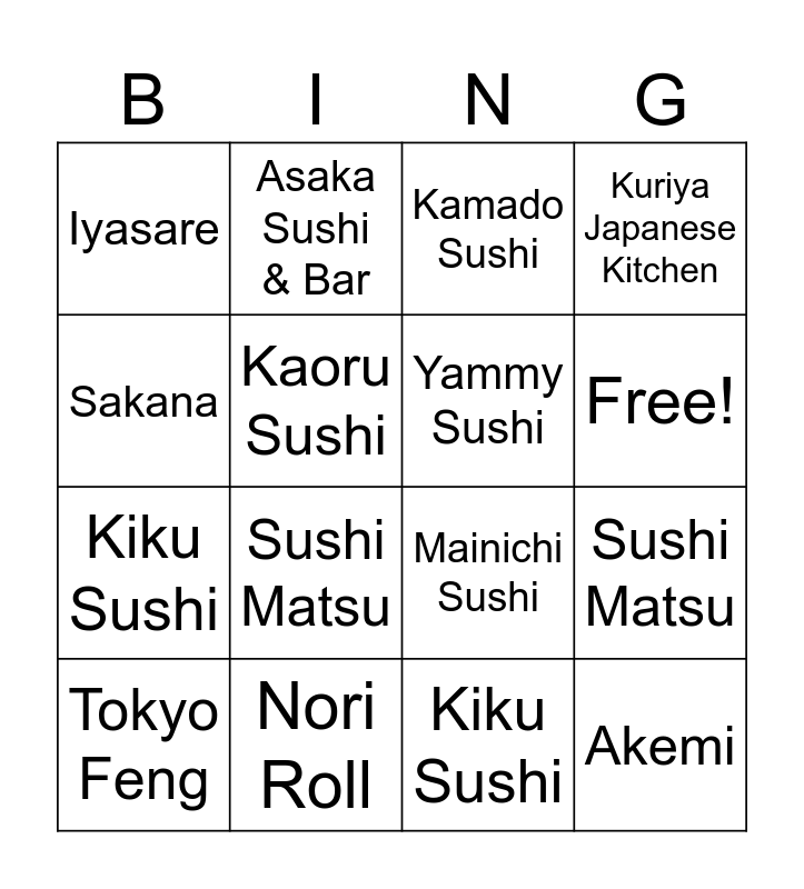 This bingo card has 17 words: Kiku Sushi, Tokyo Feng, Kamado Sushi, Iyasare, Sushi Matsu, Kuriya Japanese Kitchen, Sushi Matsu, Yammy Sushi, Free!, Kaoru Sushi, Nori Roll, Mainichi Sushi, Sakana, Asaka Sushi & Bar, Kiku Sushi, Itani Sushi and Akemi.