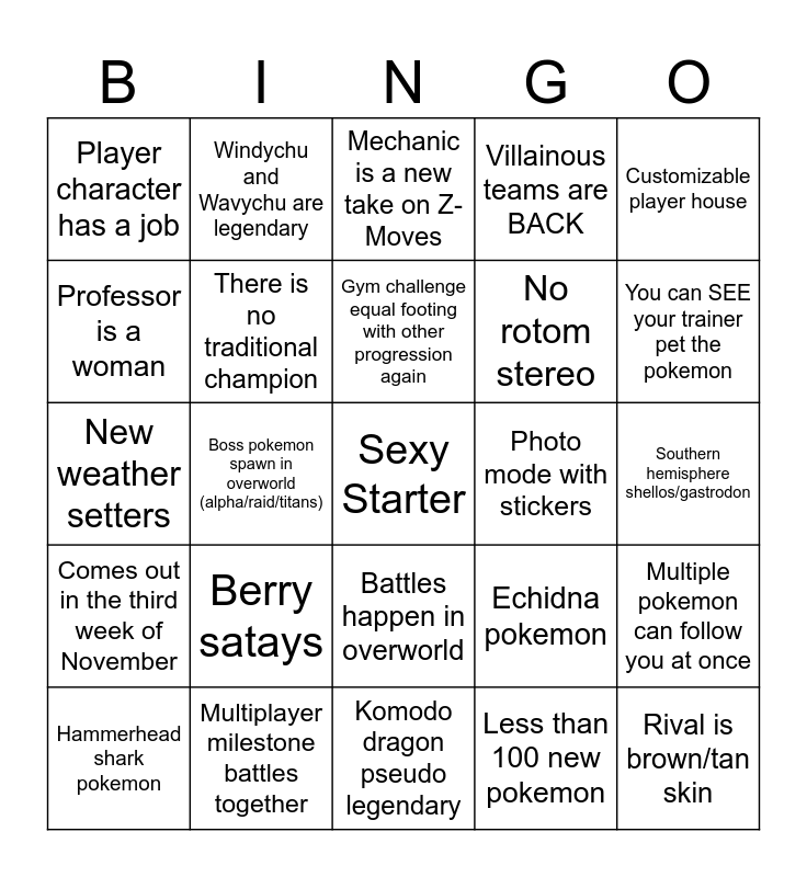 This bingo card has a free space and 24 words: Berry satays, Multiplayer milestone battles together, Gym challenge equal footing with other progression again, Hammerhead shark pokemon, Customizable player house, Player character has a job, Professor is a woman, Windychu and Wavychu are legendary, Photo mode with stickers, Battles happen in overworld, No rotom stereo, New weather setters, Echidna pokemon, Multiple pokemon can follow you at once, There is no traditional champion, Less than 100 new pokemon, Southern hemisphere shellos/gastrodon, Mechanic is a new take on Z-Moves, You can SEE your trainer pet the pokemon, Boss pokemon spawn in overworld (alpha/raid/titans), Rival is brown/tan skin, Comes out in the third week of November, Villainous teams are BACK and Komodo dragon pseudo legendary.