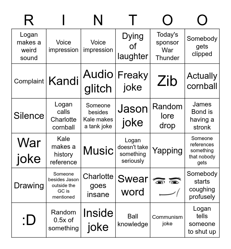 This bingo card has 1 images and 35 words: Swear word, Charlotte goes insane, Ball knowledge, Complaint, War joke, Jason joke, Kandi, Inside joke, Today's sponsor War Thunder, Actually cornball, Dying of laughter, Somebody starts coughing profusely, Logan calls Charlotte cornball, Freaky joke, Logan makes a weird sound, Drawing, Random lore drop, Silence, Voice impression, Someone besides Kale makes a tank joke, Kale makes a history reference, Logan doesn't take something seriously, Music, Yapping, Voice impression, Zib, Random 0.5x of something, Audio glitch, Somebody gets clipped, Logan tells someone to shut up, :D, Someone references something that nobody gets, James Bond is having a stronk, Someone besides Jason outside the GC is mentioned and Communism joke.