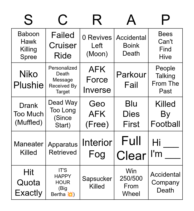This bingo card has a free space and 53 words: Ship Ambushed By Dogs, Accidental Company Death, Dealer Blackjack, Win 250/500 From Wheel, Apparatus Retrieved, Clutch Play, Failed Cruiser Ride, Froggy Chair, Niko Plushie, Single Item Day, Personalized Death Message Received By Target, Get Down, Hi ___ I'm ___, Full Clear, NO Items Retrieved, Hit Quota Exactly, AFK Force Inverse, Blu Dies First, Death By Bees, Bees Can't Find Hive, Dead Way Too Long (Since Start), Snack Time, Parkour Fail, Baboon Hawk Killing Spree, Spending Too Long At Company Building, IT'S HAPPY HOUR (Big Bertha 💥), Player Killed Through Ship, Fun Endgame Shenanigans, Brain Cell Sharing Moment, People Talking From The Past, Guest/Uncommon Player Joins, Easter Egg Death, Walkie/Phone Death, Sucked From Ship, Teleport To GBJ, Clip OOB, Accidental Boink Death, Sapsucker Killed, 0 Revives Left (Moon), Double Revive Glitch, Immediate Maneater/Jester, Trap Enemy In Level, Killed By Football, Smug Dance, Hoarding Bug/Nutcracker Infestation, Interior Fog, Stuck Scrap, Jetpack Crash, Drank Too Much (Muffled), Maneater Killed, Worm Eats An Enemy, Rare Enemy Spawn and Bait An Enemy To Spike/Landmine Itself (And Live).