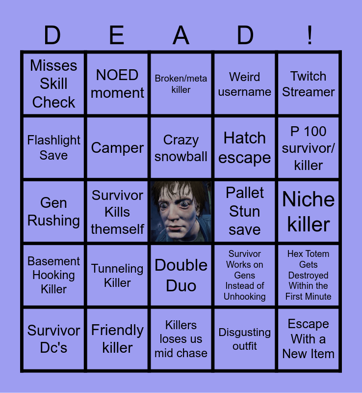 This bingo card has a free space and 24 words: Survivor Dc's, Tunneling Killer, Crazy snowball, Disgusting outfit, Twitch Streamer, Misses Skill Check, NOED moment, Broken/meta killer, Pallet Stun save, Niche killer, Gen Rushing, Camper, Survivor Works on Gens Instead of Unhooking, Hex Totem Gets Destroyed Within the First Minute, Flashlight Save, Friendly killer, Killers loses us mid chase, Weird username, P 100 survivor/ killer, Basement Hooking Killer, Survivor Kills themself, Double Duo, Hatch escape and Escape With a New Item.