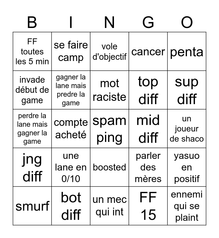 This bingo card has a free space and 24 words: une lane en 0/10, bot diff, mot raciste, smurf, penta, FF toutes les 5 min, invade début de game, se faire camp, mid diff, boosted, top diff, perdre la lane mais gagner la game, parler des mères, yasuo en positif, gagner la lane mais predre la game, FF 15, un joueur de shaco, vole d'objectif, sup diff, compte acheté, ennemi qui se plaint, jng diff, cancer and un mec qui int.