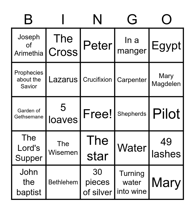 This bingo card has a free space and 44 words: Jesus, Mary, Joseph, John the baptist, The devil, Turning water into wine, Peter, John, Egypt, Bethlehem, In a manger, Shepherds, The star, The Wisemen, Judas Iscariot, 30 pieces of silver, Betrayed, Garden of Gethsemane, Sermon on the Mount, Mary Magdelen, The Cross, 3 nails, 3 days, Joseph of Arimethia, The apostles, Pilot, Ciaphus, The Pharasees, Water, The Lord's Supper, The Passover, 49 lashes, Crown of thorns, Miracles, 5 loaves, 2 fish, Feeds the 5000 men, Blood, Crucifixion, Prophecies about the Savior, Carpenter, Herod, Lazarus and Martha.